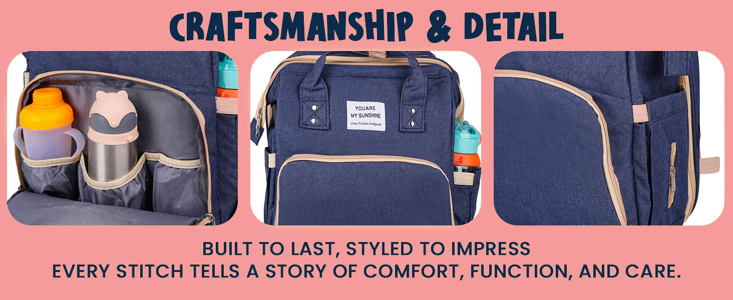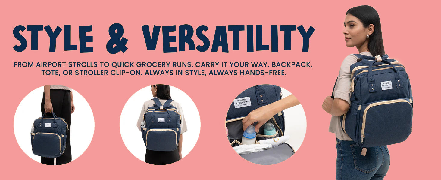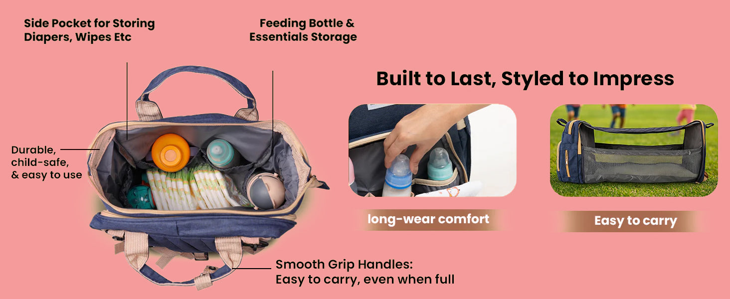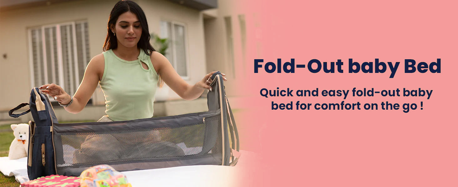 Diaper Bag | Foldable Baby Bed & Changing Station | 11 Pockets, Insulated Bottle Holders, USB Port|Water Resistant | Maternity Bag